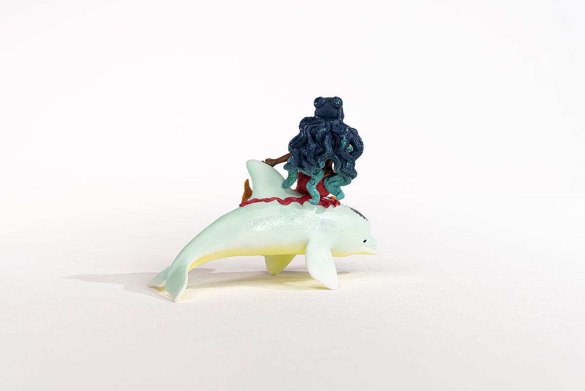 If you hear the voice of the sea when you listen to your heart, the voice you hear is the mermaid Isabelle. Isabelle dances on the water, singing songs to the stars above, her pearl white dolphin companion always by her side. The Isabelle on Dolphin playset features a toy dolphin figurine paired with a breath-taking mermaid figure shimmering with pearlescent accents and sparkling glitter. From the mermaid's long flowing hair and shimmering tail to the dolphin's pearlescent skin.