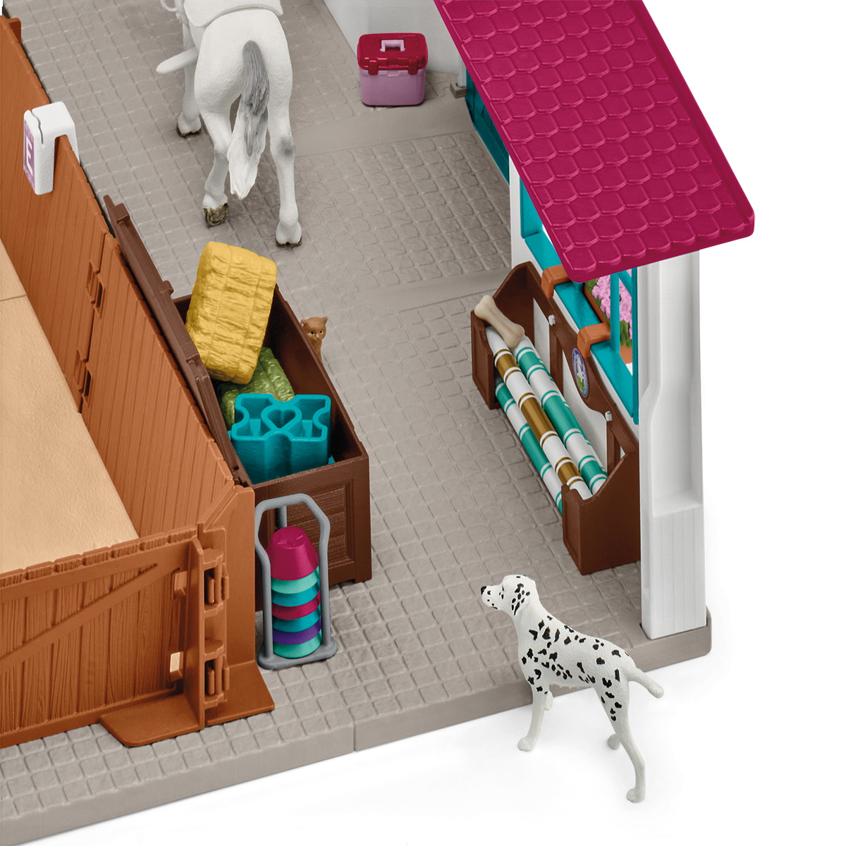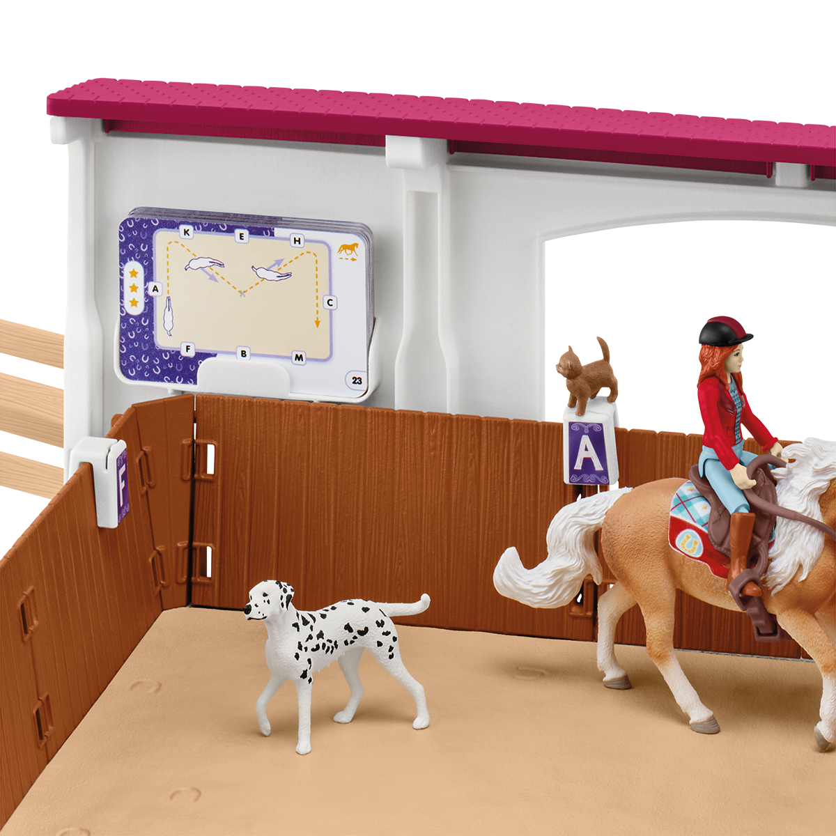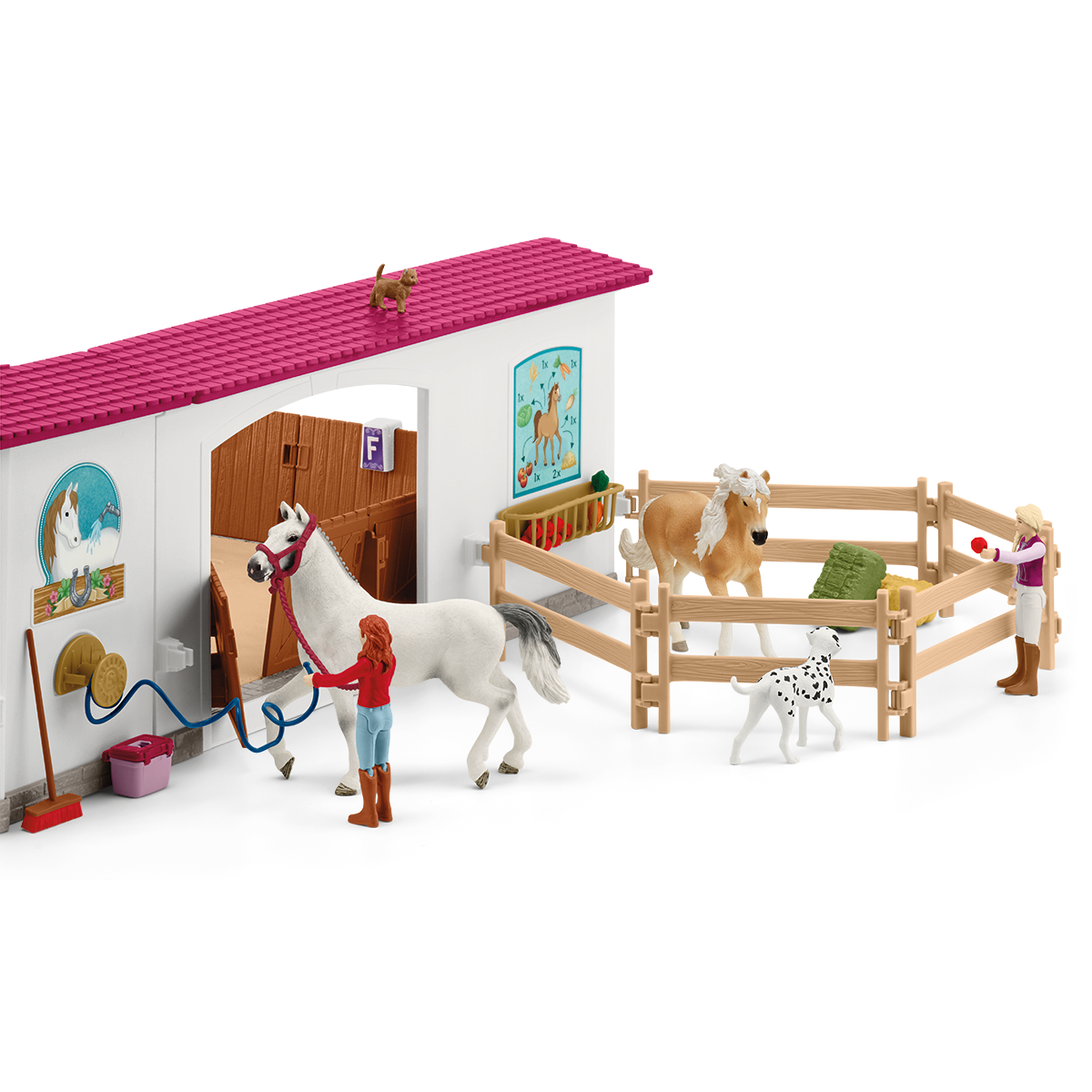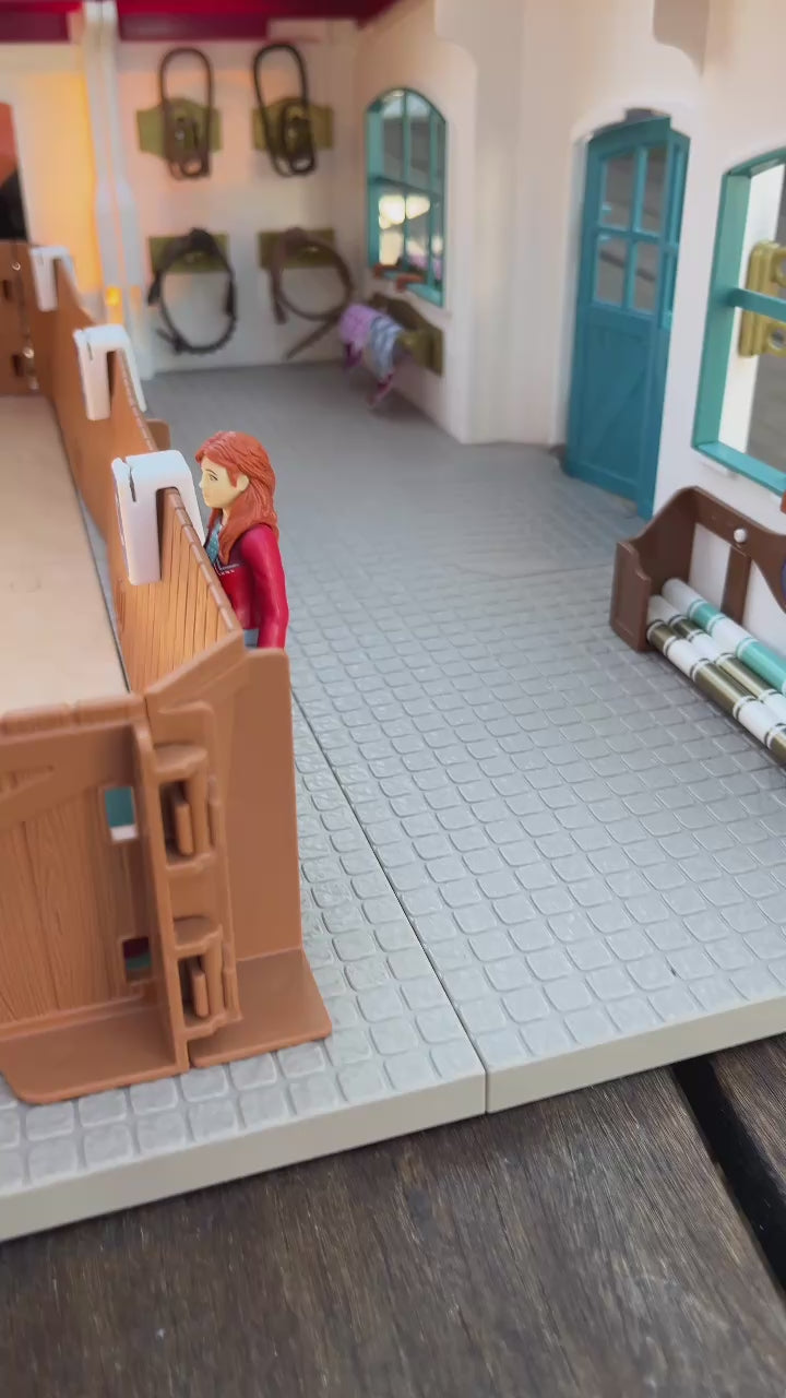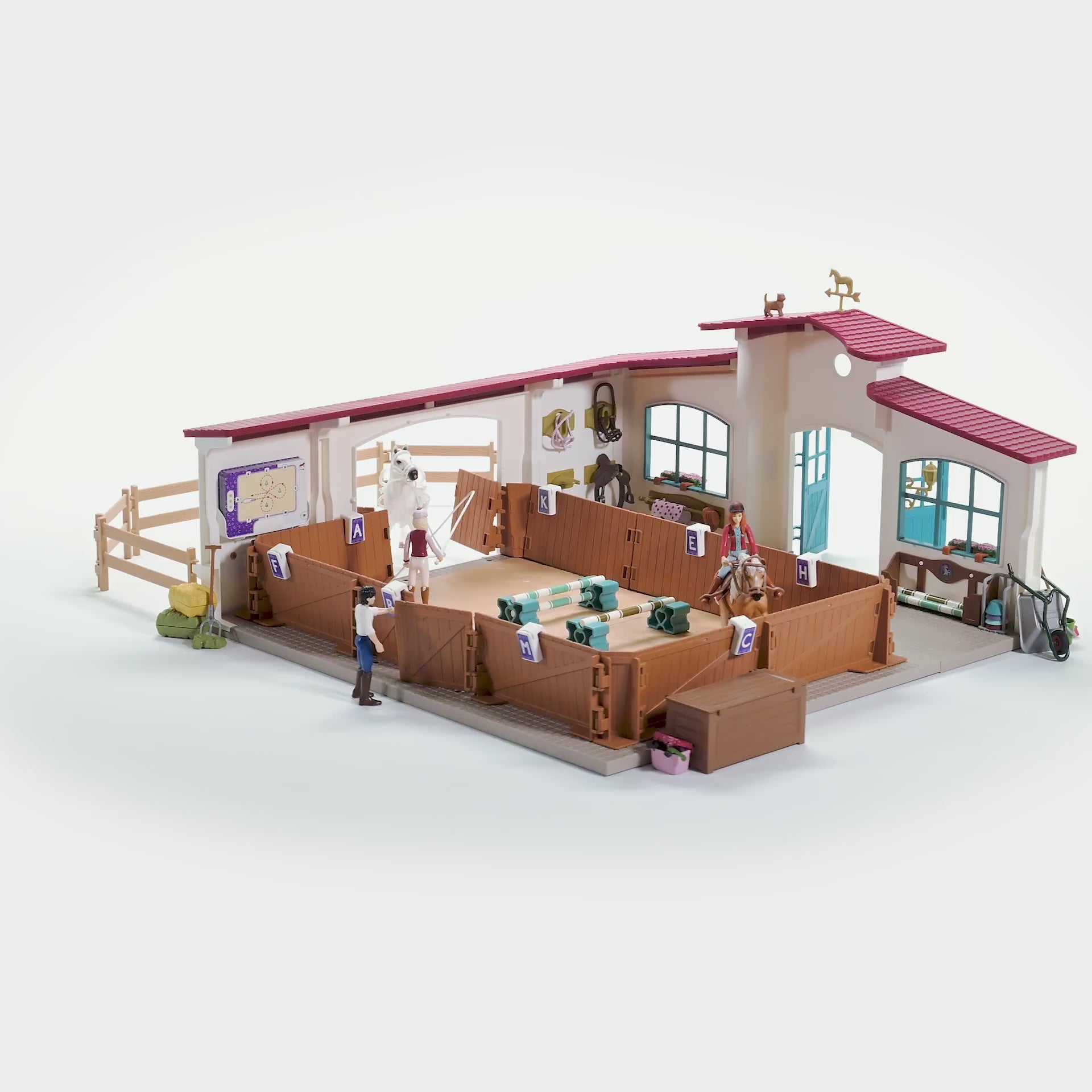 In the riding hall everything is prepared for vaulting and show jumping. There are obstacles in different degrees of difficulty and flashcards with many different dressage movements and tasks to try out. So it never gets boring. After training, the horses are hosed down with water and groomed. Of course, there's a crunchy apple as a reward.